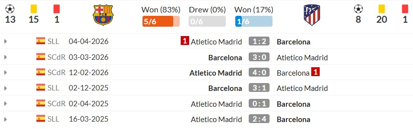 Một trong những chi tiết đáng chú ý nhất trước trận Barcelona vs Atletico Madrid là chuỗi đối đầu gần đây. Theo dữ liệu bạn gửi, Barcelona thắng 5 trong 6 lần gặp gần nhất, còn Atletico Madrid chỉ thắng 1. Những tỷ số như 2-1, 3-0, 3-1 hay 4-0 cho thấy ưu thế ấy không chỉ nằm ở kết quả, mà còn ở cách Barcelona thường xuyên khiến Atletico Madrid lúng túng trong các giai đoạn quan trọng của trận đấu.