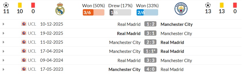 Lịch sử gần đây của Real Madrid vs Man City cho thấy đây là cặp đấu không có khái niệm an toàn. Trong 6 lần gặp nhau gần nhất theo thống kê bạn gửi, Real Madrid thắng 3, hòa 1 và Man City thắng 2. Điều đó nói lên mức độ cân bằng rất cao, ngay cả khi mỗi trận lại mang màu sắc chiến thuật khác nhau.
