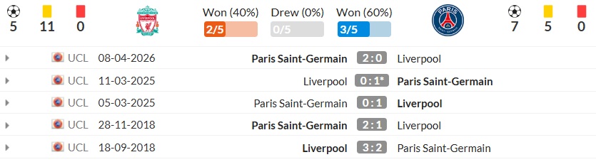 Xét trong các lần chạm trán gần đây, Liverpool vs PSG là cặp đấu khá cân bằng về kết quả tổng thể. Theo dữ liệu bạn gửi, mỗi đội thắng 2 trong 5 lần đối đầu gần nhất, và chính hai lần gặp nhau gần đây nhất cũng cho thấy sự giằng co rất rõ.